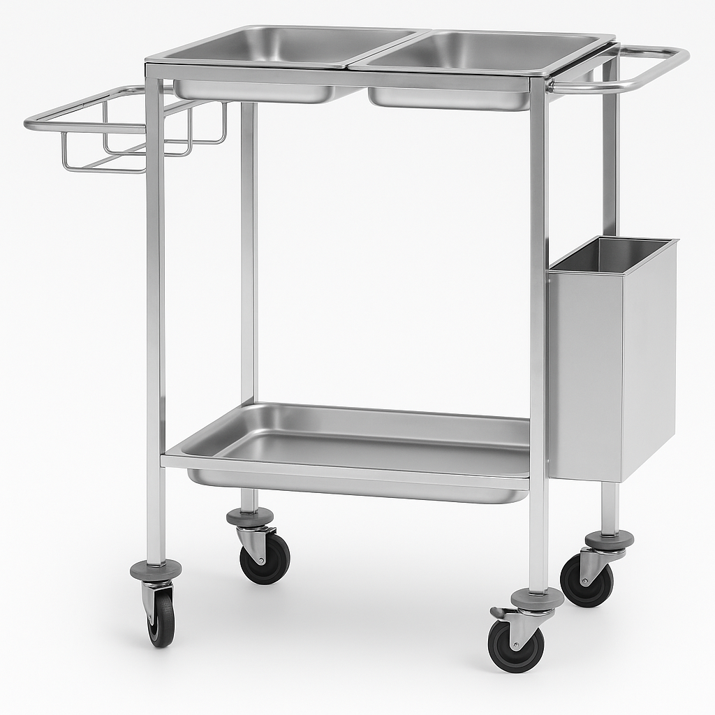 Carro de pensos c/ 3 bandejas, cesto e balde do lixo em aço inoxidável (ref. 10.MC.7111)