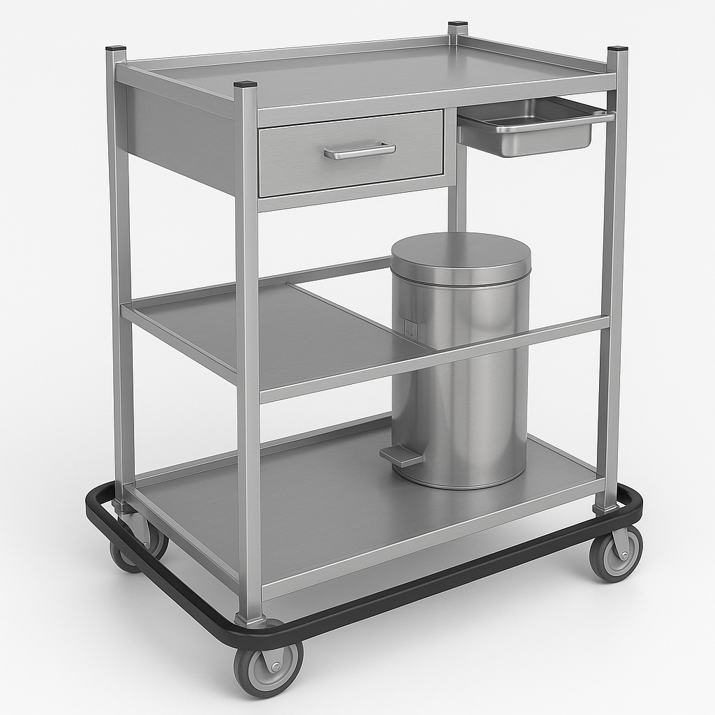 Carro de pensos c/ para-choques, c/ gaveta, 2 prateleiras, tabuleiro e balde de 12 lt. (ref. 10.CR.1515)