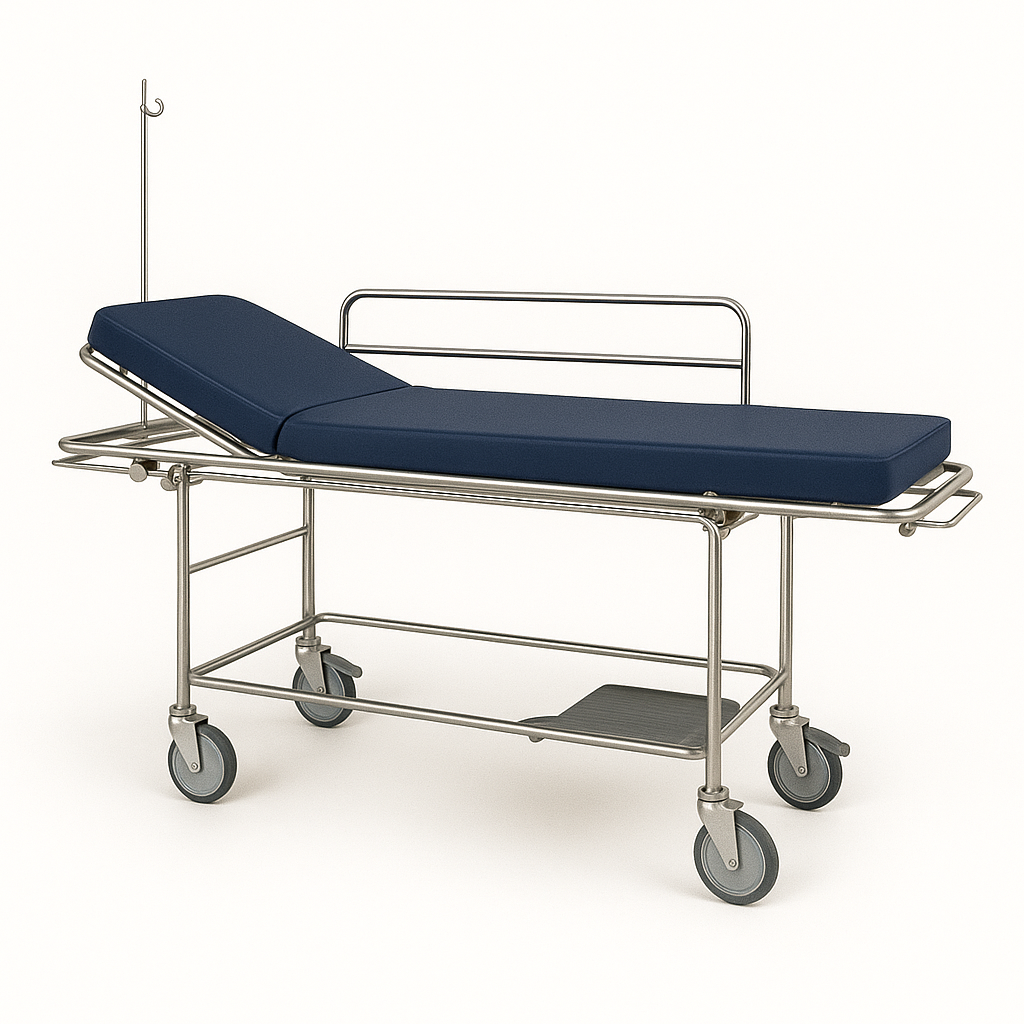 Características: Leito c/ dimensões 1900x600mm, rodas 100mm, haste soro + suporte de roupa + suporte garrafa de oxigénio em aço c/acabamento epoxy incluidos - 2100x718x880mm