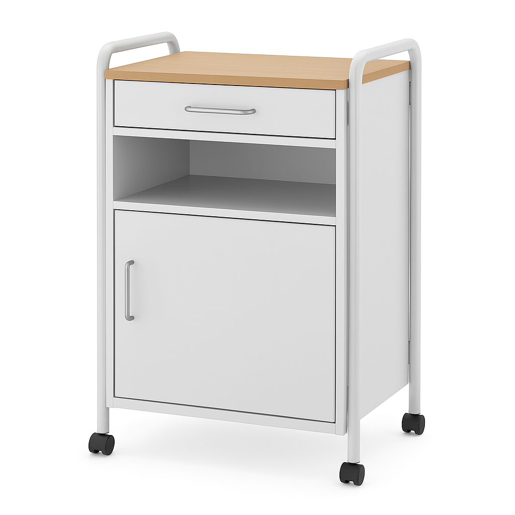 Características: , c/ 1 gaveta + porta em aço, tampo melamina, estrutura em tubo redondo aço inox