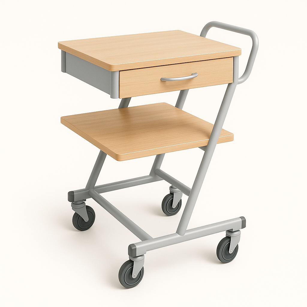 Mesa p/ aparelhos, c/ gaveta, em aço c/ acabamento epoxy, c/ prateleiras e gaveta em melamina (ref. 10.ME.1836)